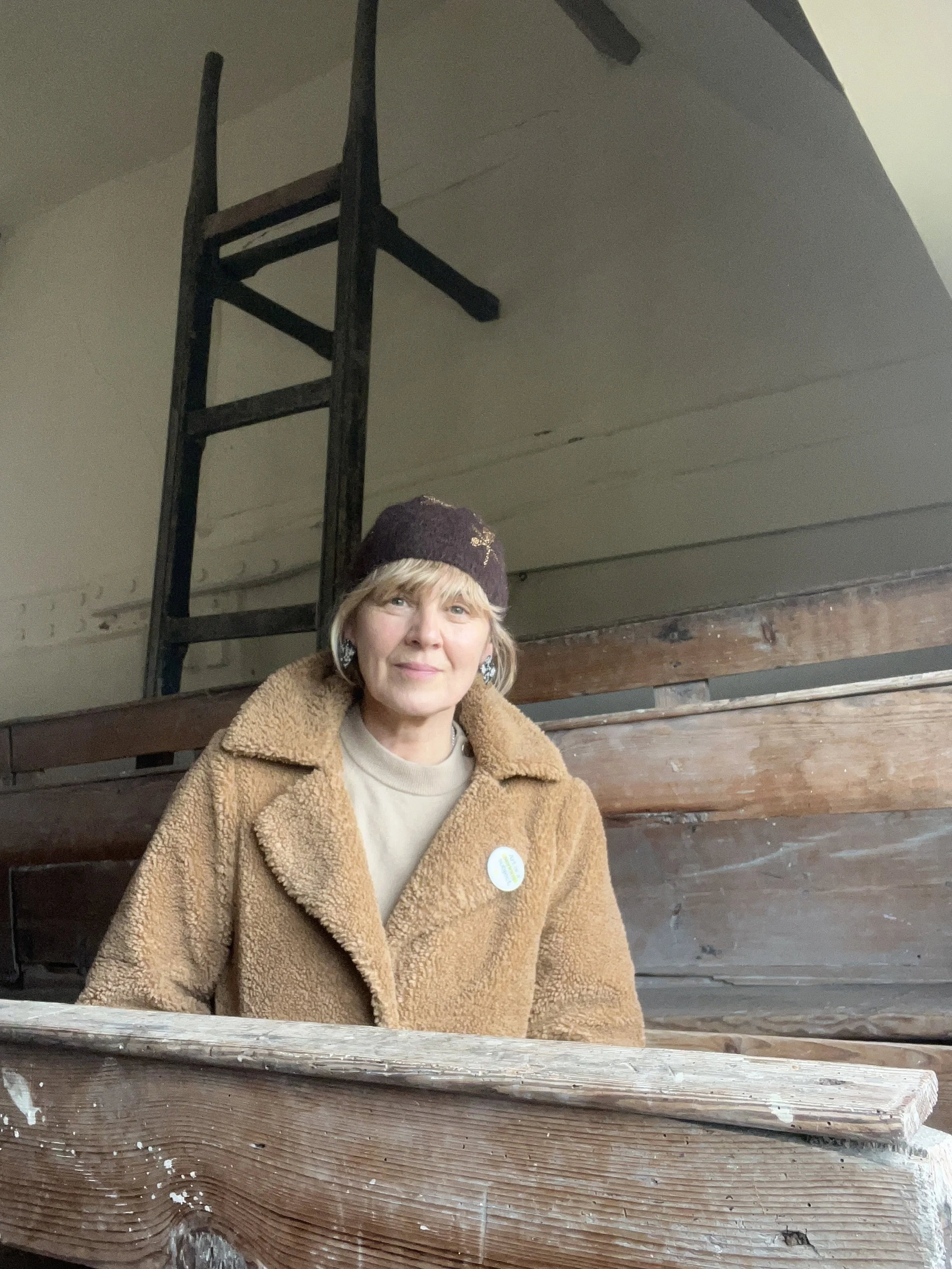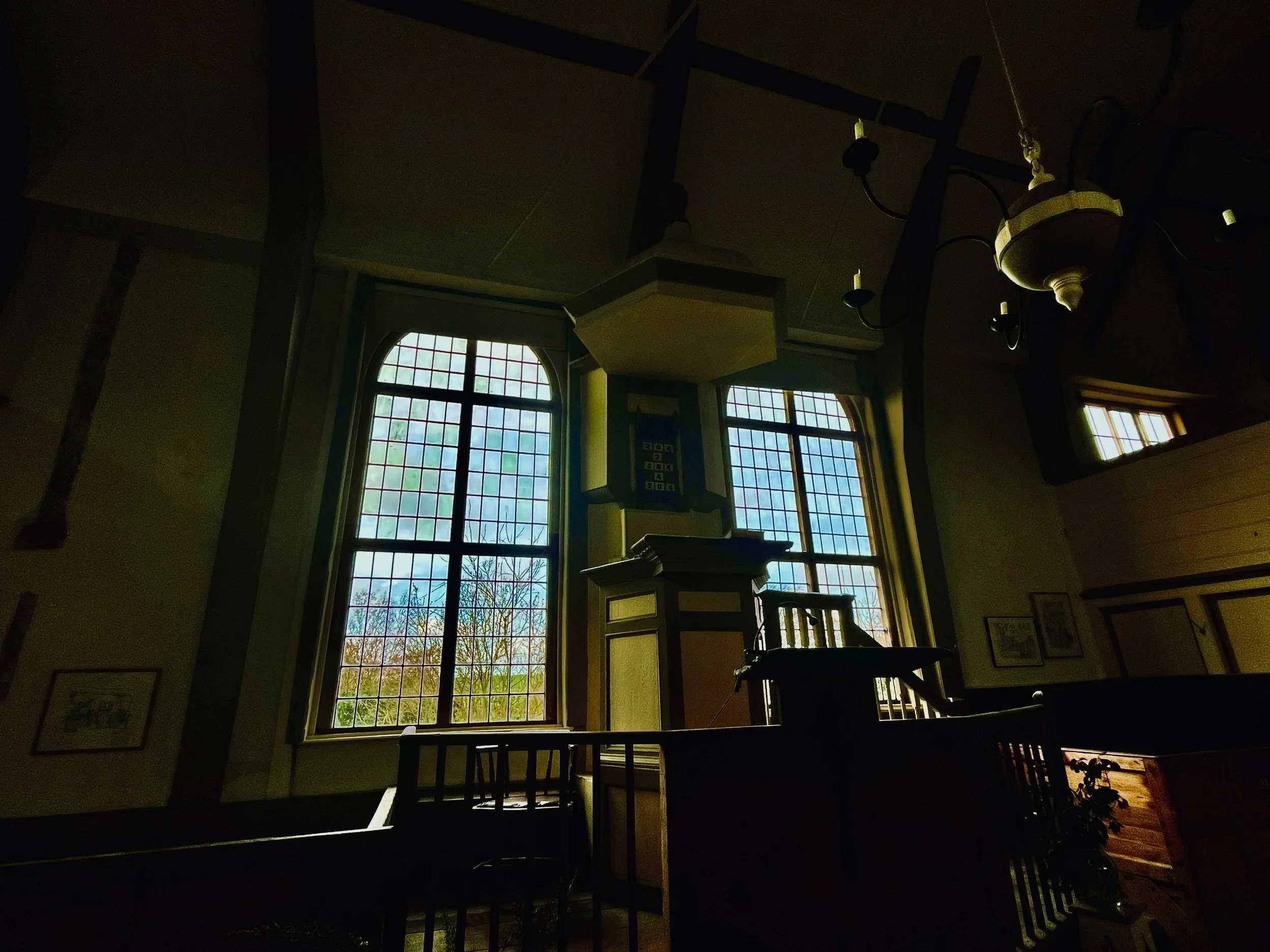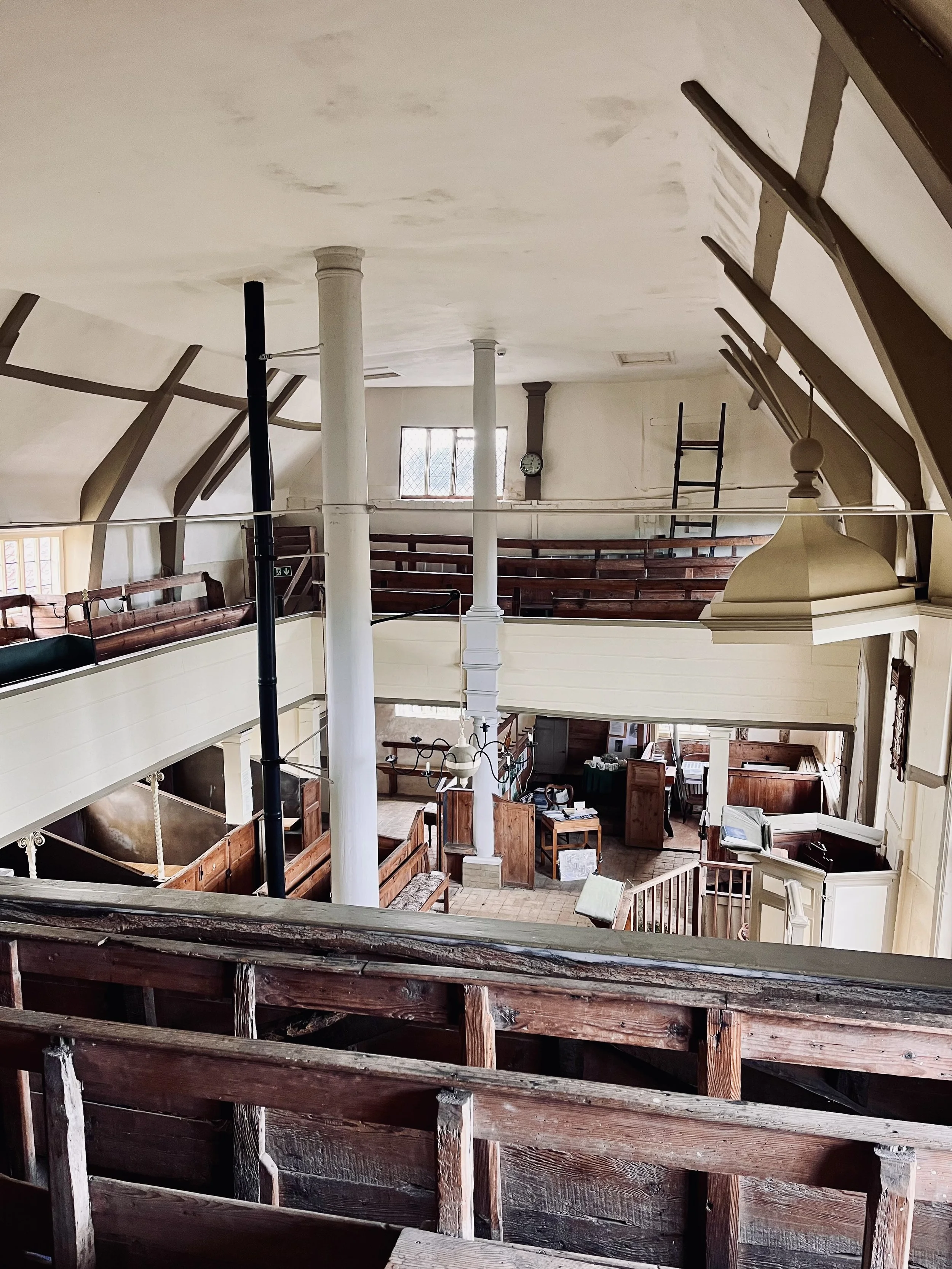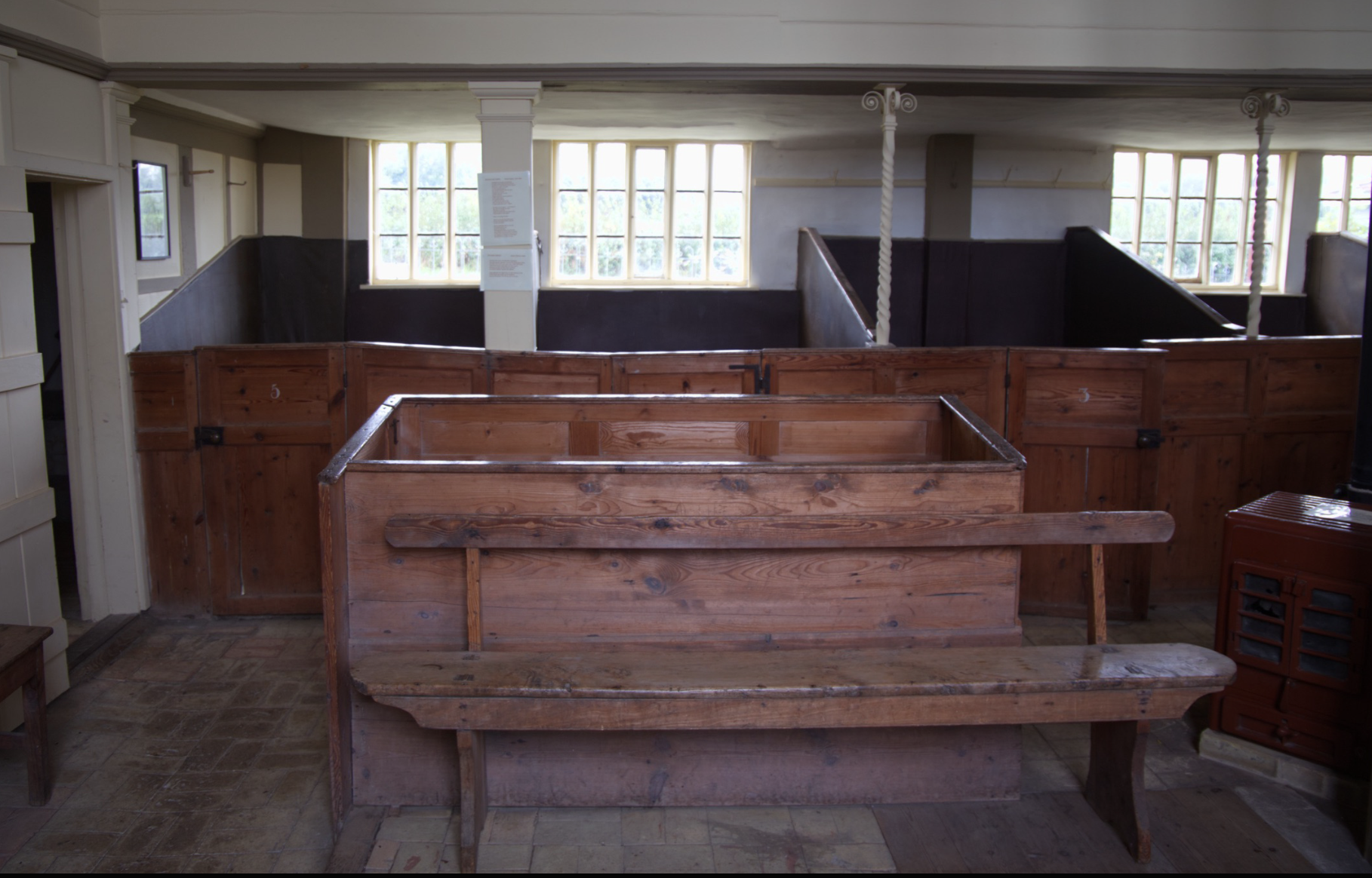 In accordance with their beliefs, the chapel is plain; no altar and no sign of the cross. 18C century pine box pews populate the interior.